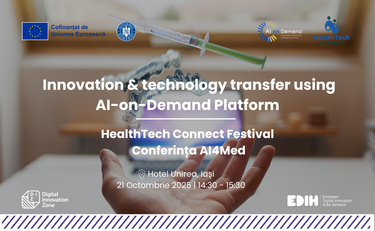 Te așteptăm pe 21 octombrie 2025, la workshopul organizat de Digital Innovation Zone, în parteneriat cu AI on Demand, în cadrul conferinței AI4Med – Precision Medicine in AI Era, parte din Festivalul HealthTech Connect Iași, o inițiativă a Universității Tehnice „Gheorghe Asachi” din Iaşi în parteneriat cu Universitatea de Medicină și Farmacie Grigore T. Popa Iași, Universitatea Națională de Știință și Tehnologie Politehnica București și Universitatea „Alexandru Ioan Cuza” din Iași.