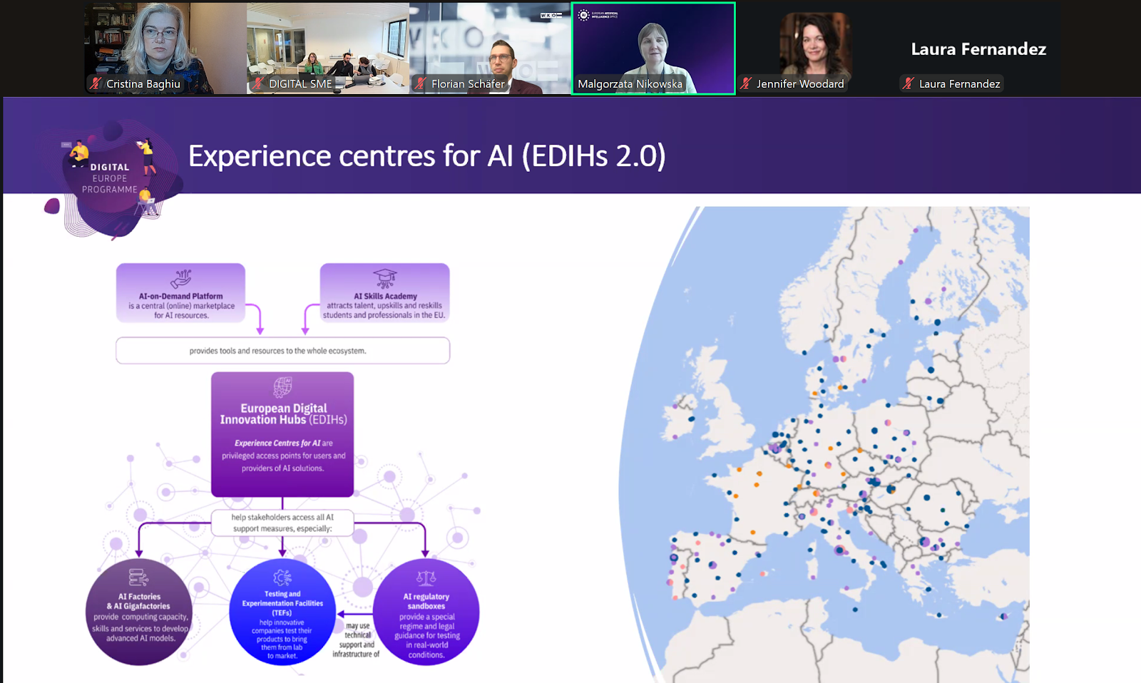 - tools offered to SMEs for adopting “made in Europe” AI solutions (infrastructures, AI factories, EDIHs, skills academies)