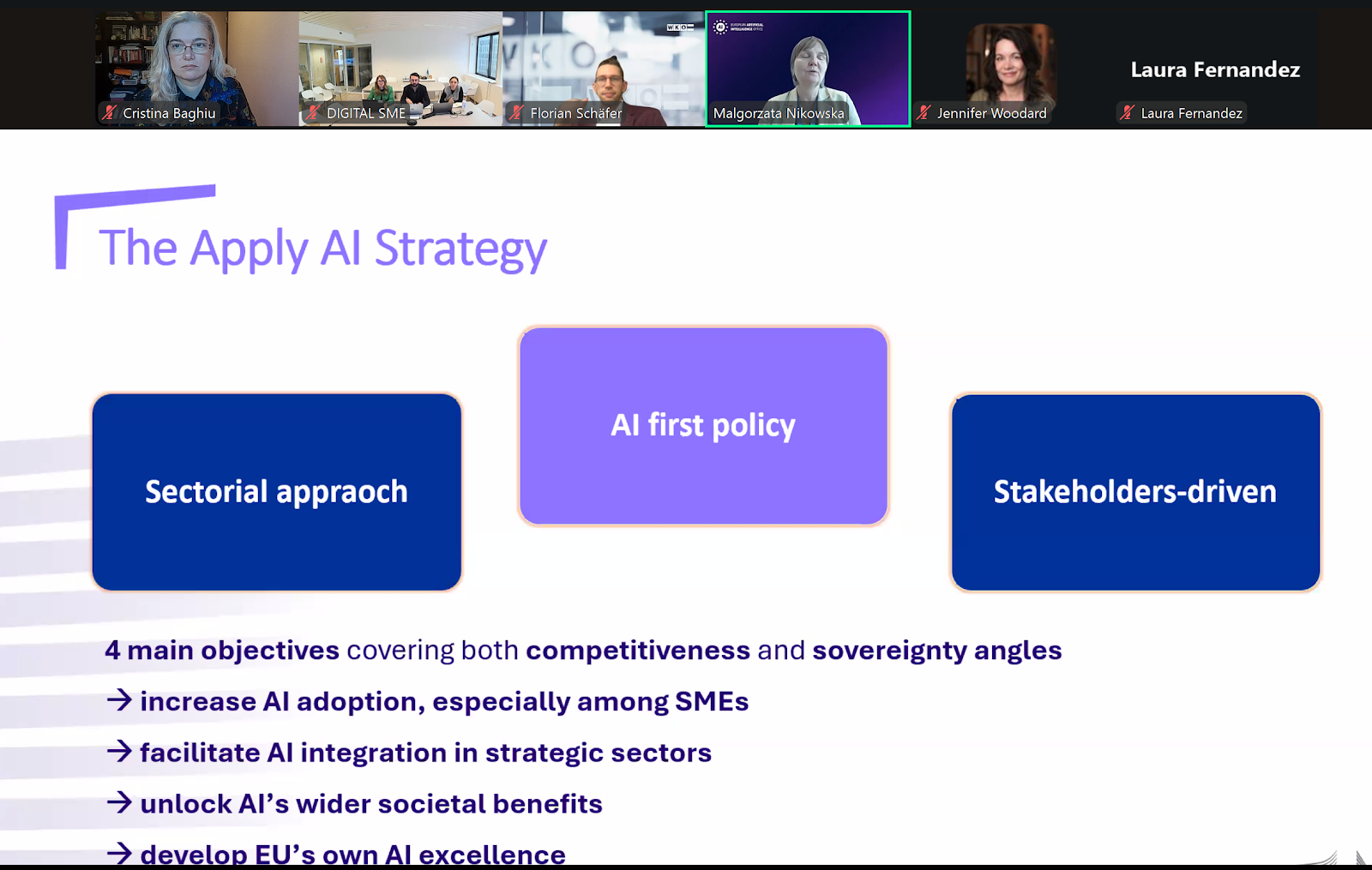 On 13 November 2025, between 14:00-15:30, under the auspices of the European DIGITAL SME Alliance, the event „Apply AI: SMEs at the forefront of Europe’s AI sovereignty” took place. The event focused on the strategic ambitions of the Apply AI Strategy – the European plan for accelerating the adoption of artificial intelligence across strategic sectors, with the participation of Cristina Baghiu, Coordinator of the Digital Innovation Zone.
