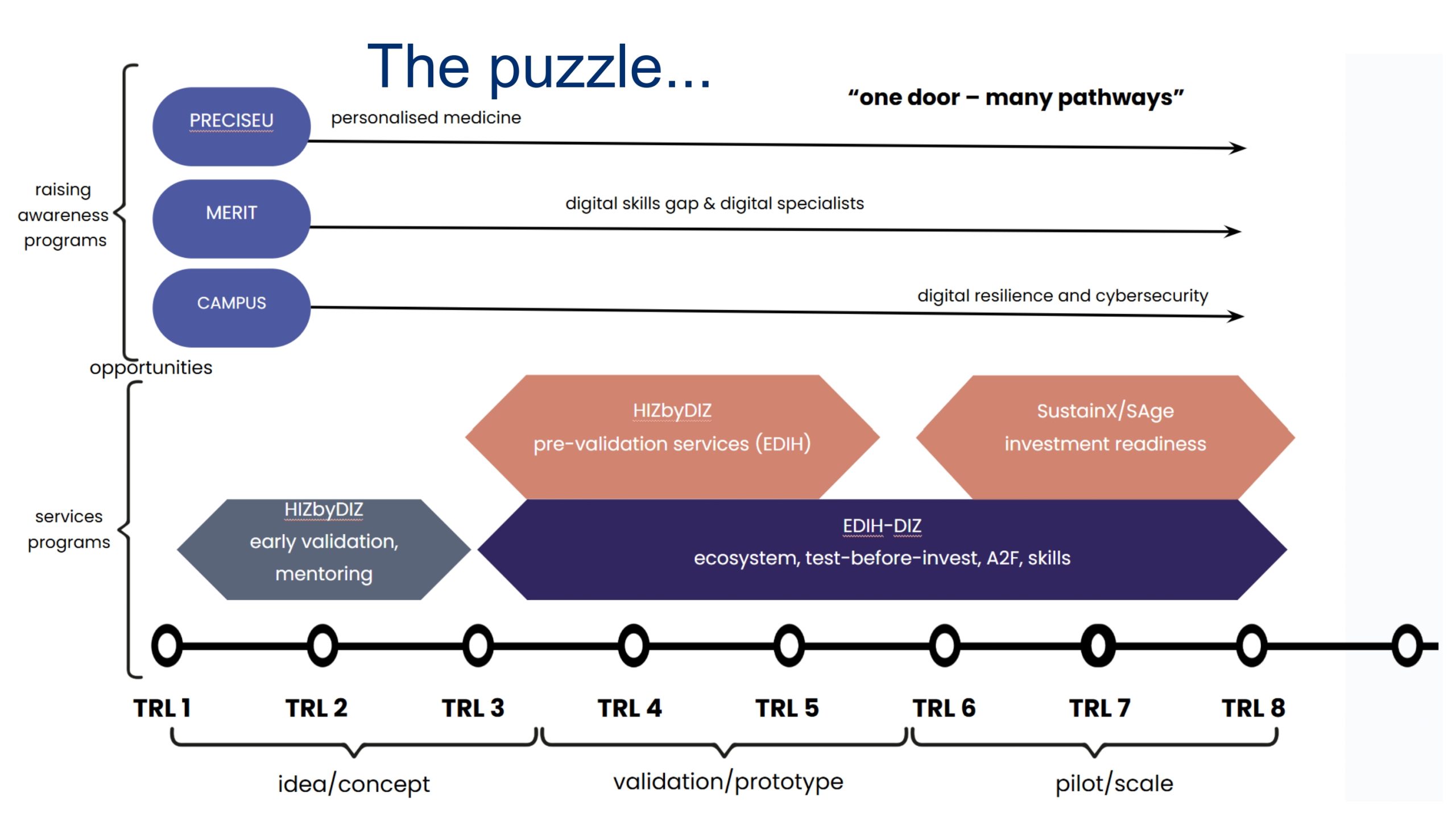 În „puzzle-ul” prezentat, SustainX și SAge-Hub sunt așezate pe lanțul TRL 1–8 alături de alte programe DIZ (de conștientizare și dezvoltare de competențe, precum PRECISEU, MERIT sau CAMPUS) și de serviciile EDIH (test before invest, acces la finanțare, dezvoltare de competențe).