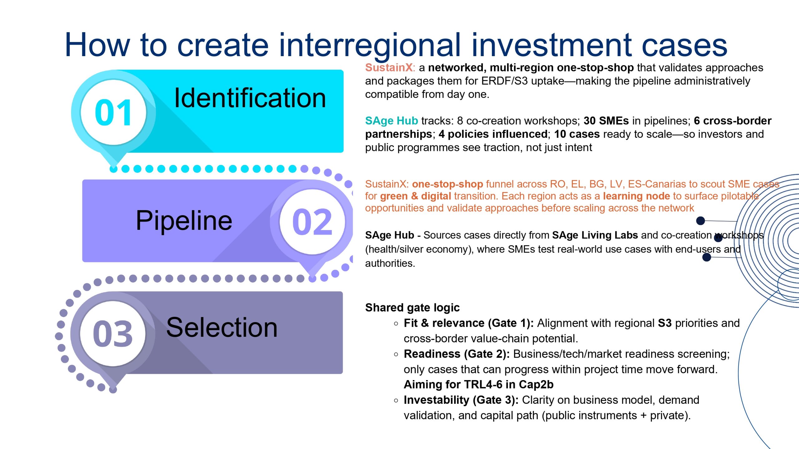 - Gate 1 – Fit & relevance: aliniere cu prioritățile S3 și potențialul de a intra într-un lanț valoric transfrontalier.