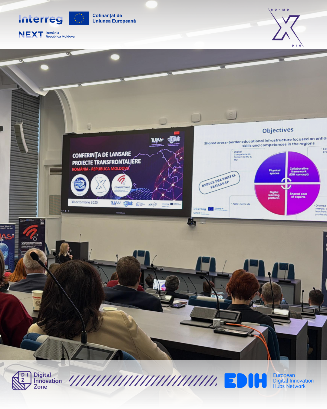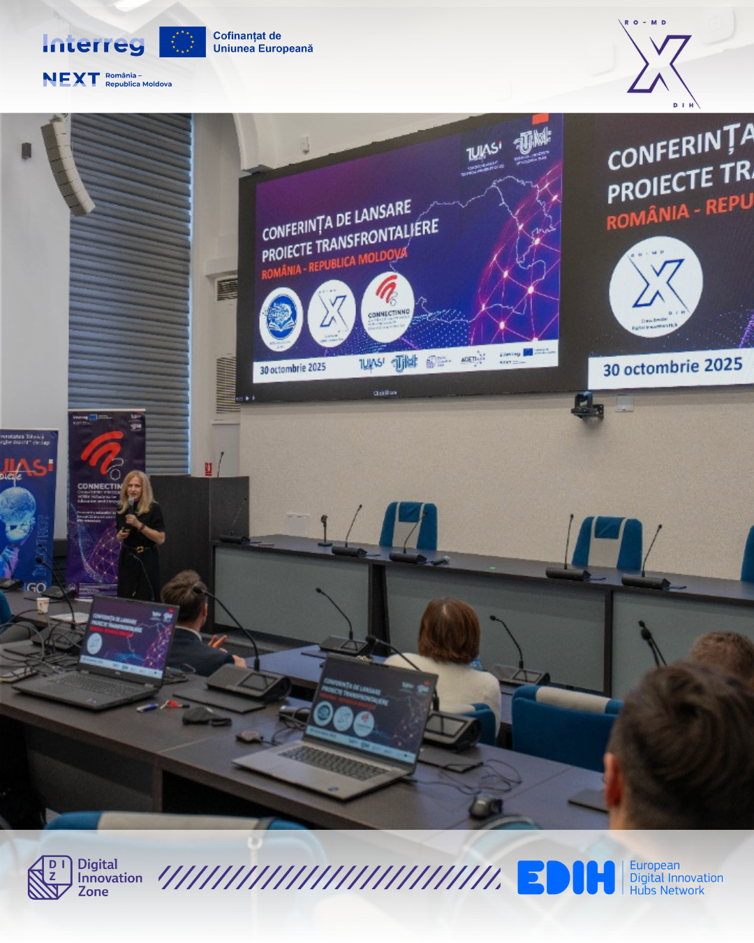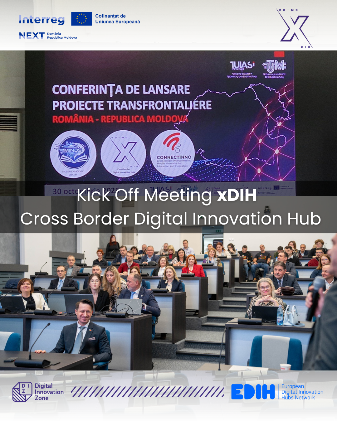 Joi, 30 octombrie 2025, Universitatea Tehnică „Gheorghe Asachi” din Iaşi (TUIASI), a găzduit lansarea oficială – Kick Off Meeting-ul programului xDIH – Cross Border Digital Innovation Hub, un proiect european transfrontalier derulat în parteneriat cu TUIASI, ACETI – Asociația pentru Dezvoltarea Comunicațiilor Electronice și Tehnologiilor Inovaționale, Universitatea Tehnică a Moldovei și Digital Innovation Zone.