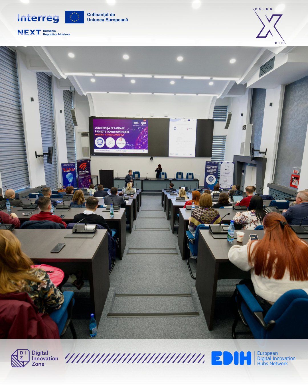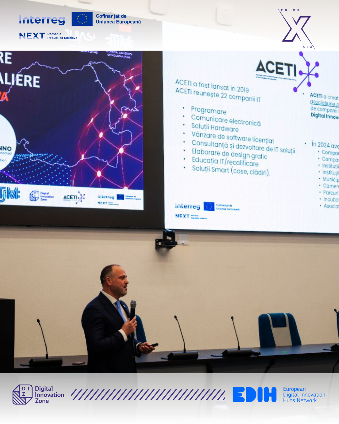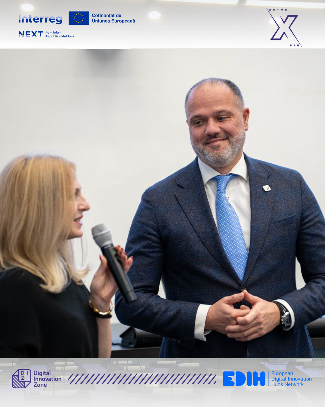 Evenimentul s-a desfășurat în cadrul Conferinței de lansare a proiectelor transfrontaliere România–Republica Moldova, alături de Cristina Baghiu – Coordonator Digital Innovation Zone, conf. dr. ing. Simona Caraiman – Prorector Informatizare și Comunicații Digitale în cadrul TUIAȘI și Manager proiect xDIH, dar și de partenerii noștri din Republica Moldova, Ion Coșer – Consul General al Republicii Moldova la Iași, Ion Bodrug – Președinte ACETI, Daniela Pojar – Prorector pentru Finanțe și Relații Internaționale, Universitatea Tehnică a Moldovei.