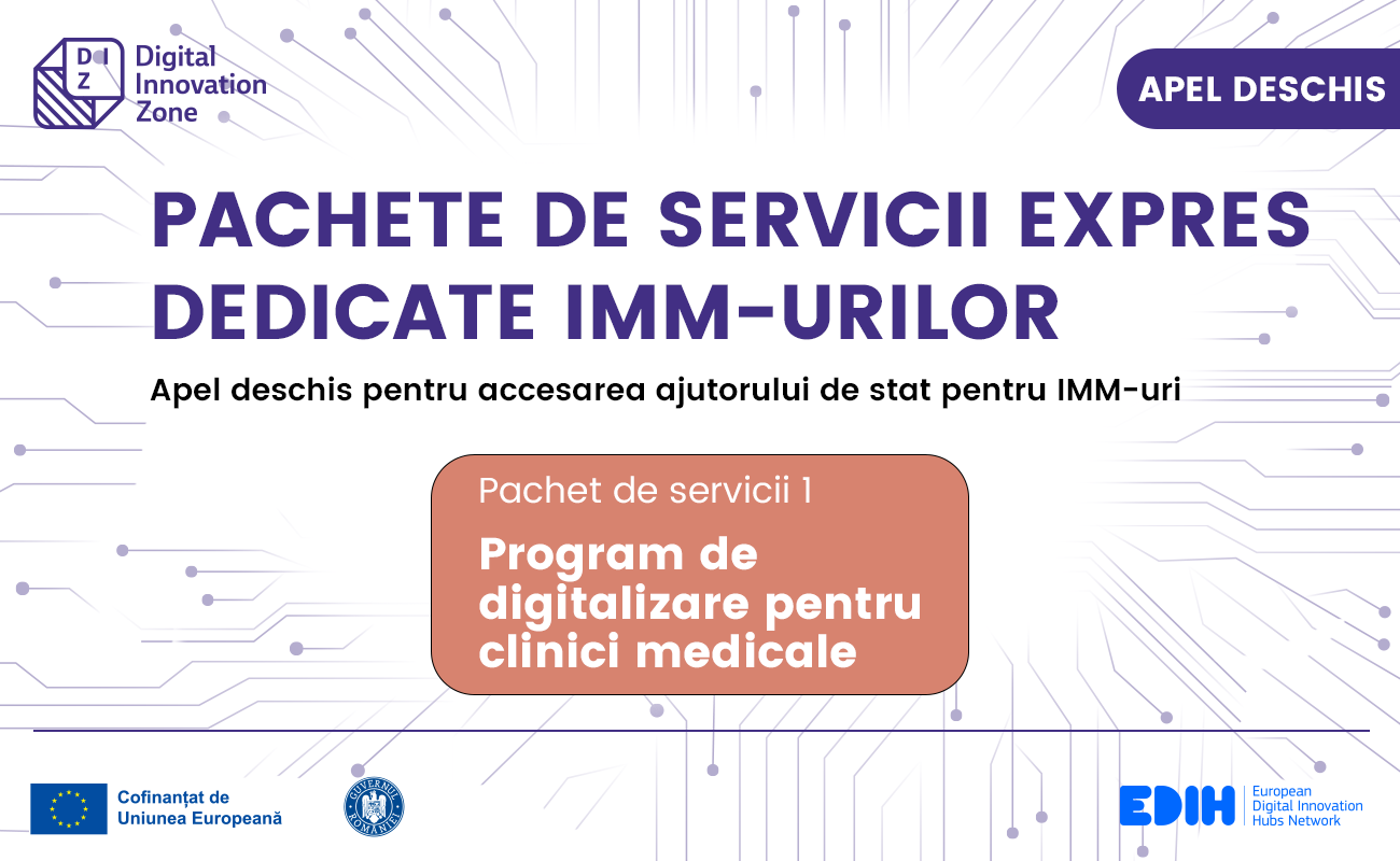 Vă informăm că în cadrul apelului pachete de servicii expres dedicate IMM-urilor s-a lansat pachetul de servicii expres dedicate clinicilor medicale, un program complet de digitalizare coordonat de Digital Innovation Zone și partenerul său de tehnologie Romsoft, împreună cu Universitatea de Medicină și Farmacie Gr.T.Popa din Iași, Clusterul Imago Mol și Iceberg Plus.